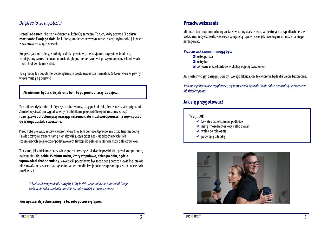 Przed Tobą pierwszy zestaw ćwiczeń, który Ci w tym pomoże. Opracowany przez fizjoterapeutę Pawła Szczygła i trenera Kamę Nienałtowską, czyli przez nas – ludzi kochających ruch i rozumiejących go jako zbiór podstawowych funkcji, do pełnienia których służy ciało człowieka.